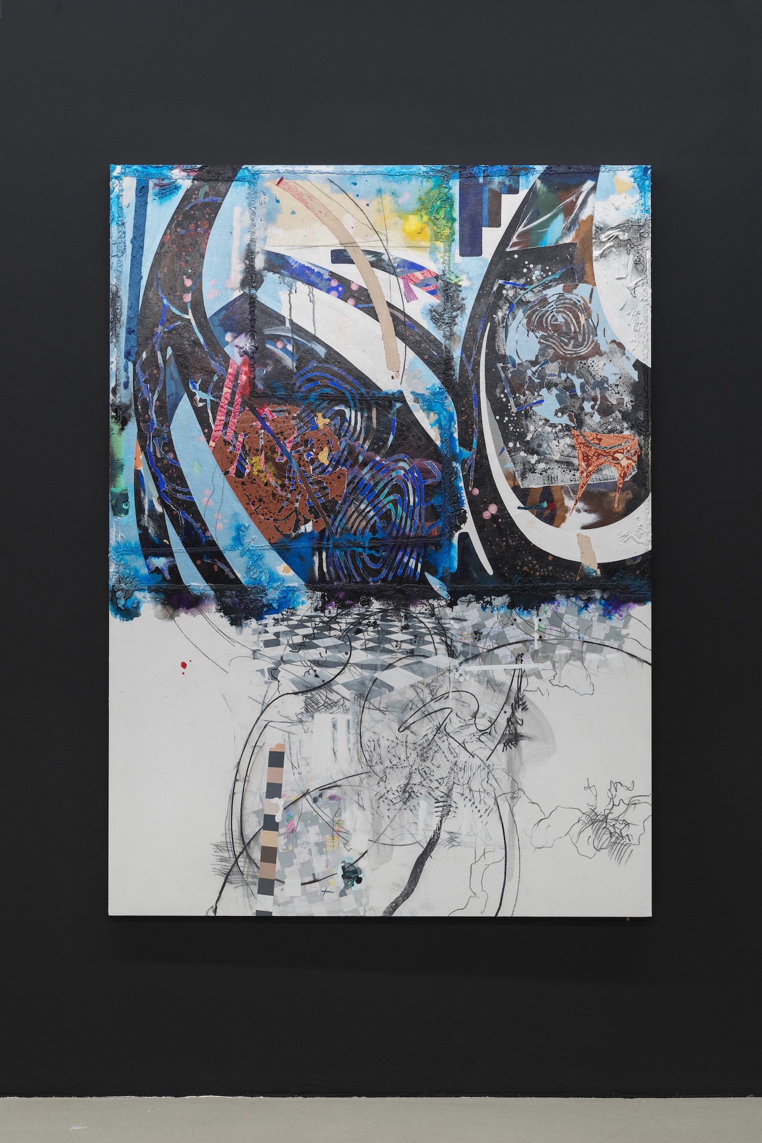A white Dress, a Blue Ribbon, 2020. Acrylic, charcoal, modelling paste, sand, and collage on canvas, 167 x 121 cm.